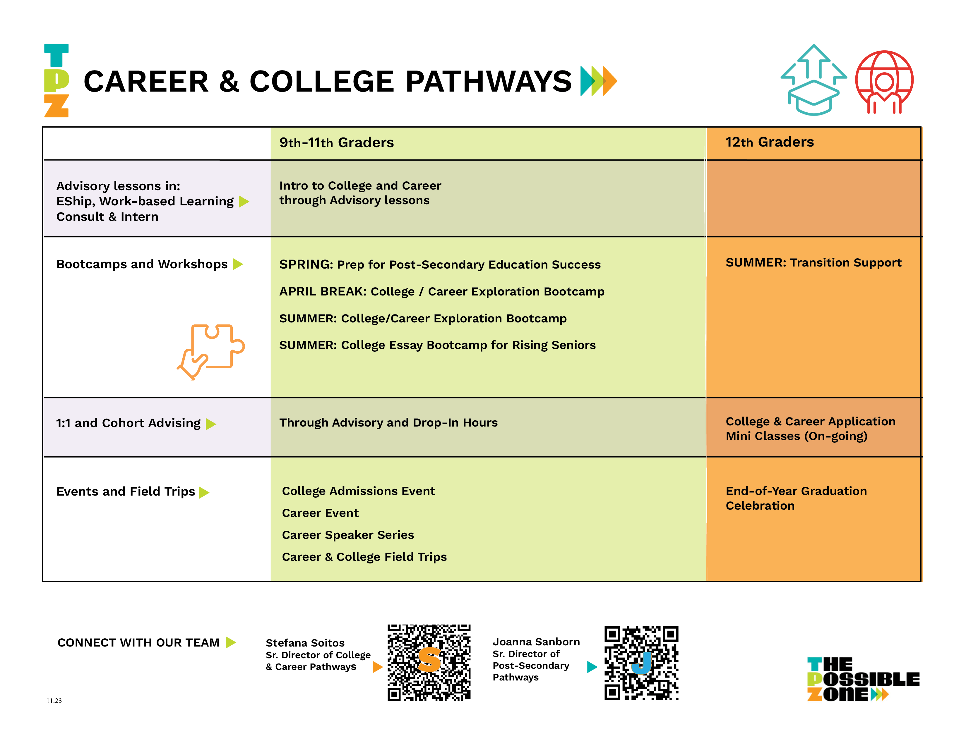 In our College & Career Advisory program, students in Grades 9-12 learn about Pathways offerings at TPZ. They explore career and college options, research educational institutions, and craft their post-high school plans. Professionals from various industries come in and share their college and career stories and answer students’ questions to shine light on different pathways. Throughout their journey at TPZ, students also participate in group advisory lessons and personalized advising sessions with the Pathways team.